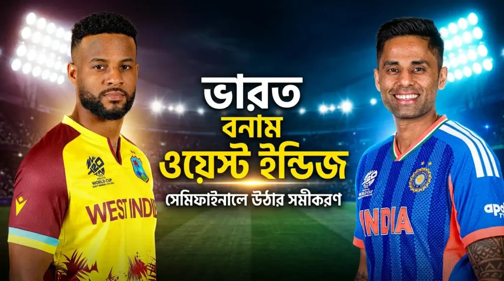 ভারত এবং ওয়েস্ট ইন্ডিজের মধ্যকার এই অত্যন্ত গুরুত্বপূর্ণ ম্যাচটি আইসিসি টি২০ বিশ্বকাপ ২০২৬-এর সুপার ৮ পর্বের ৫২তম ম্যাচ হিসেবে আজ ইডেন গার্ডেন্স, কলকাতায় অনুষ্ঠিত হচ্ছে। এটি দুই দলের জন্যই ভার্চুয়াল কোয়ার্টার ফাইনাল — জয়ী দল সরাসরি সেমিফাইনালে উঠবে। ম্যাচটি এখনো শুরু হয়নি এবং শুরু হবে আজ সন্ধ্যা ৭:০০ (ভারতীয় সময়) অর্থাৎ বাংলাদেশ সময় সন্ধ্যা ৭:৩০ মিনিটে।